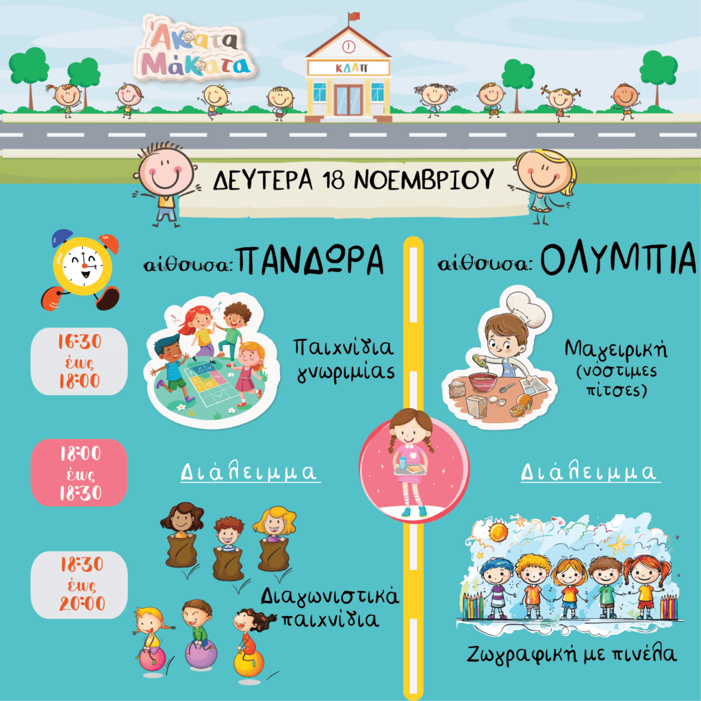 ΕΝΑΡΞΗ ΔΕΥΤΕΡΑ 18 ΝΟΕΜΒΡΙΟΥ 2024 από 16:30 Παρακάτω θα δείτε το πρόγραμμα δραστηριοτήτων της Δευτέρας εβδομάδες γνωριμίας με δωρεάν δράσεις