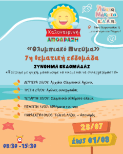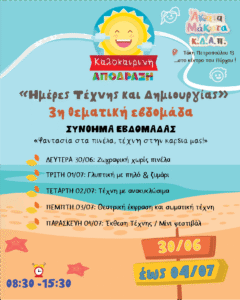 Από 16 Ιουνίου έως 1 Αυγούστου, καθημερινά από 08:30 έως 15:30, οι μικροί μας φίλοι (5–12 ετών) θα συμμετέχουν σε ένα πλήρως οργανωμένο πρόγραμμα με: