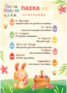 Το ΚΔΑΠ σας προσκαλεί να περάσετε το Πάσχα του 2025 με μια μοναδική εμπειρία γεμάτη δραστηριότητες, παιχνίδι και μάθηση! Από 14 – 17 Απριλίου & 22 – 25 Απριλίου , προσφέρουμε πρωινή απασχόληση για παιδιά ηλικίας 5-12 ετών με τις εξής δραστηριότητες: